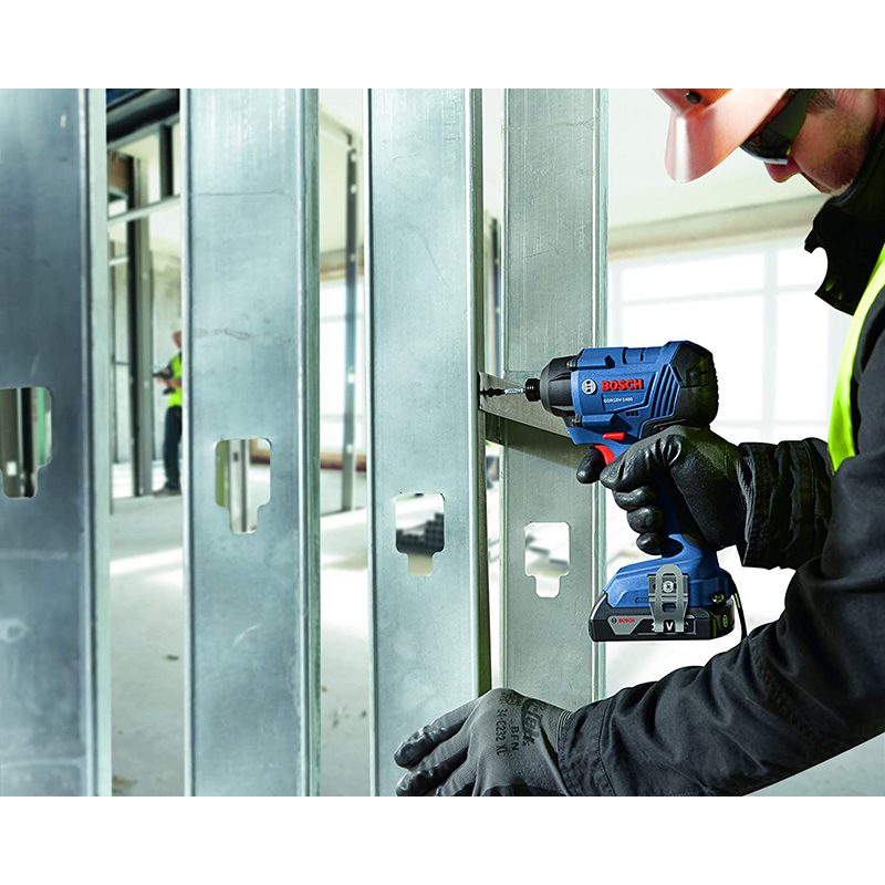 The Bosch GXL18 V-26B22 18 V Two-Tool Cordless Combo Kit features two reliable pro tools for drilling and driving production on the job site – the GSR18 V-190, 1/2″ Compact Drill/Driver and the GDR18 V-1400, 1/4″ Hex Impact Driver. The GSR18 V-190 is a powerful cordless drill designed to provide users with 480″-lbs. of max. torque plus up to 1,700 no-load RPM of high-speed drilling. The tool weighs 2.8 lbs. It is ideal for overhead tasks, with a short head-length for tight spots. The GDR18 V-1400, 1/4″ Hex Impact Driver delivers 1,400″-lbs. of max. torque. Bosch’s hammer-and-anvil system provides driving impact endurance, and the tool provides 3,600 blasts per minute to handle the toughest material. This kit comes with two 2.0 Ah 18 V SlimPack batteries and a charger for a complete cordless setup.